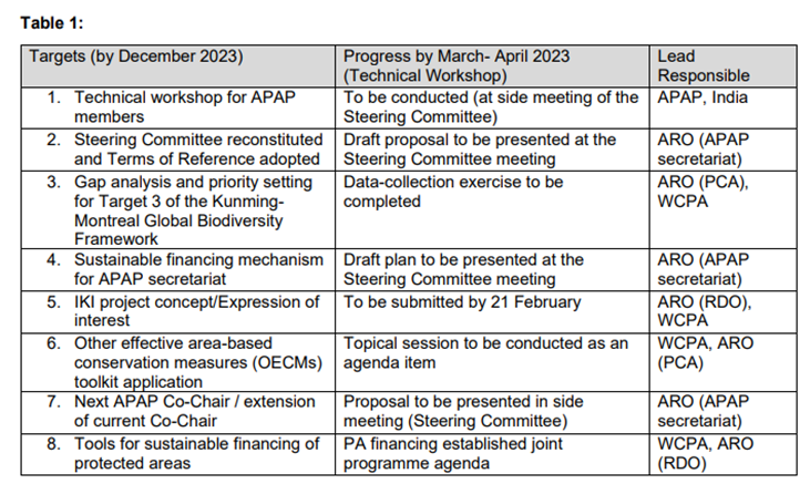 During the meeting, participants agreed on the broad priorities and strategic engagement vision for 2030 (Figure 1) as well as the specific workplan for 2023 (Table 1). APAP’s key priorities and strategic engagement are framed by four inter-related areas: transboundary protected areas, other effective area-based conservation measures (OECMs), quality and effectiveness of the protected and conserved areas, as well as marine protected areas. These are translated into eight action points for 2023, starting with the Technical Workshop to be hosted by India.